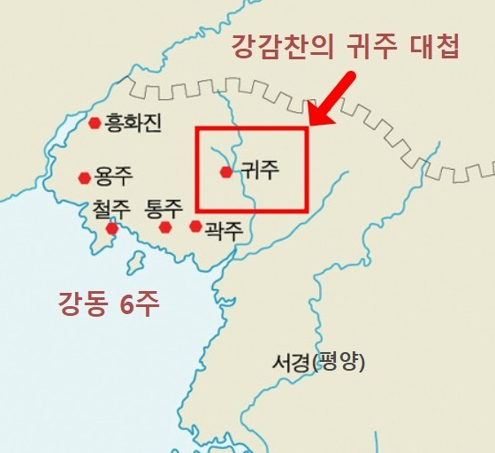 이에 소배압은 한 가지 책략을 생각해 냈는데, 어쩔 수 없이 퇴각하는 척하고 슬쩍 물러났다가 개경의 방비가 소홀해졌을 때 척후병을 보내 성문을 열어 쳐들어 갈 작전이었던 것이죠. 그렇게 전군 철수를 명령한 소배압은 몰래 척후병 300명만 개경에서 얼마 떨어지지 않은 금교역에 대기시켰는데, 이 계책마저 간파한 고려는 100여 명의 기병을 보내 거란군 300명을 공격해 사살하게 됩니다. 그렇게 이 책략마저 실패하고 말았고 고려의 청야전술로 인해 보급마저 없었으며 고려 영토 깊숙이 진입한 소배압이 이끄는 거란군은 아무것도 못한 채 고립되고 맙니다. 그래서 결국 1019년 2월 소배압은 개경 공격을 포기하고 전군 퇴각하기로 결정하죠. 거란군은 평양 근처의 고려군을 피해 크게 우회해 연주, 위주에 도착했지만 추격해 온 강감찬의 고려군에 의해 또 피해를 입게 되며 고려군은 모든 퇴각로를 틀어막은 채 거란군을 귀주로 몰아가기 시작합니다.
